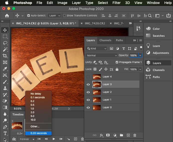 * For my Hello GIF, I made each frame 0.2 seconds, then made the last frame with the ‘O’ 0.5 seconds to create a little lapse before it goes back to the ‘H’.