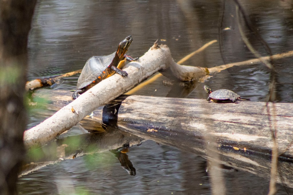 With the first over 80 degrees day of the year, we were not surprised of the amount of turtles sunbathing on every surface they could find. Walking up to this pond, we could immediately see about 8 turtles on one log. Before getting in close enough for a picture, though, a family of four children came from a nearby trail and immediately ran to the embankment. Alarmed, all the turtles jumped back in the water.